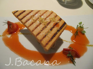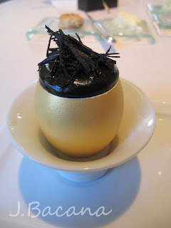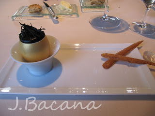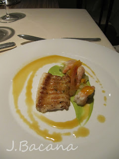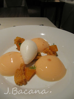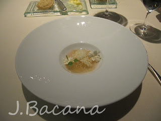 [no topo, uma massa crocante, seguida de sorbet de foie gras deitado sobre uma cama de siri (ou caranguejo? Sim, eu sei, minhas traducoes sao lamentáveis, aceito correcoes :-) ) envolto num creme maravilhoso de menta. Aliás, o legal dos molhos é que eles eram postos só quando o prato já estava na mesa, garantindo a perfeita composicao :-) ] Esse foi um dos meus pratos prediletos.