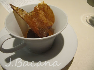 Sorvete de chocolate envolto num praline, mergulhado numa gelatina de bergamota, e decorado com folhas caramelizadas de chá. Uma das minhas sobremesas preferidas!