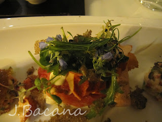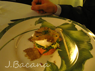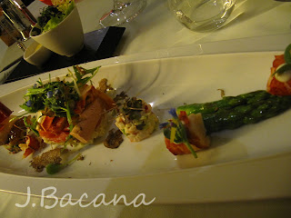 Minha entrada (que estava divina e gostosérrima): lagosta canadense, foie gras (numa espécie de pasta assim como em formato de sorbet - ambos misturados com algo alcoólico que combinou super bem!), presunto pata negra sobre uma mini salada de batata, aspargos verdes e trufas. De comer ajoelhado!