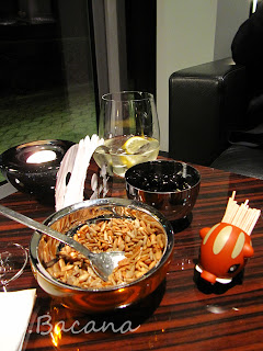 Chegando no restaurante, os aperitivos vieram acompanhados de semente de abóbora torrada e azeitonas pretas. Achei muito fofo o porquinho carregador de palitos de dente :-D