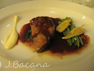 O prato principal (que demorou muuuito pra chegar): filé no molho de vinho tinto com vagens verdes, mousse de chicória...