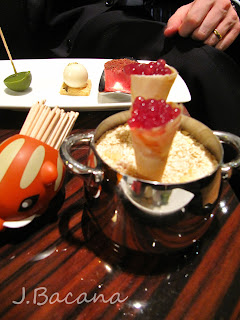 ... e mousse de beterraba, bombom de queijo parmesao e pirulito de ervilha (era cremoso e geladinho por dentro, super interessante!).
