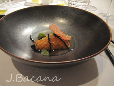 E essa é a versao quente (e a minha favorita): foie gras quente (nhac-nhac!) com salsify (é uma raiz) defumada, cebola e um biscoitinho de foie gras sobre uma torradinha de nozes que estava maravilhoso :-)