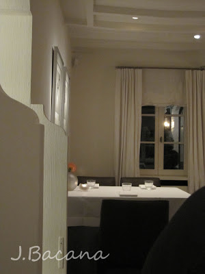 O restaurante fica numa casa de fazenda literalmente no meio do nada (como já estava escuro quando chegamos, nao fotografei do lado de fora). Dentro, nós achamos o ambiente um pouco frio (leia-se: nada aconchegante), além de bastante formal. Apesar que o ar formal foi quebrado rapidinho com a minha câmera: eu perguntei se havia algum problema em fotografar os pratos, e recebi como resposta que nao havia problema nenhum. Entao comecei a fotografar cada prato novo que chegava. A mesa do nosso lado, me vendo em acao, se animou e de repente uma senhora sacou a câmera e tiraram váááárias fotos dos membros da família, em diferente constelacoes (o marido e a esposa, o marido a esposa e a vovó, o marido a esposa e a irma, o marido a esposa e o cunhado, e assim foi, todos se amontando num lado da mesa para ficarem bem na foto). Foi bem divertido :-D