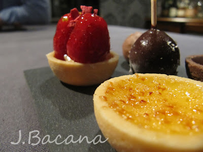 E a última tentacao: amuse-bouche doce. Tortinha de morango, um praline, um pirulito de chocolate com sorvete de côco (acho eu), uma tortinha de chocolate com um pedacinho de kunquat, tortinha com creme brulee