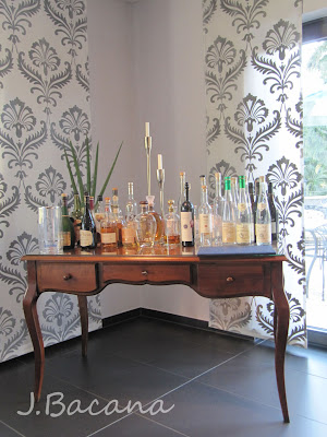Numa mesa de canto, as garrafas de aperitivos e licores.