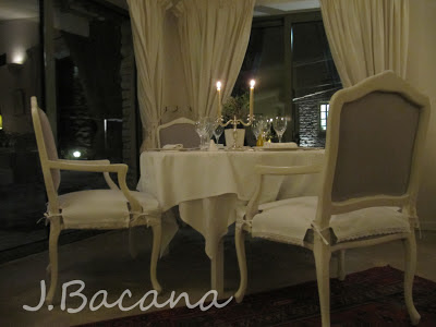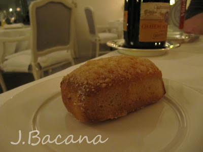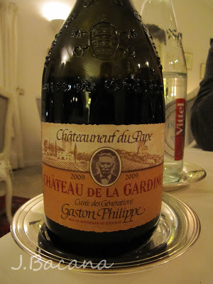 Como entrada, rolinhos de berinjela e bacalhau recheados com caranguejo acompanhados de uma vinagrete cítrica (ou algo do gênero, hehehe). A seguir, peixe John Dory assado e flor de abobrinha recheada com 'pesto Genovese' e molho. O segundo prato eu nao sei traduzir, entao vai em english mesmo: spice macarron with sauteed foie gras, compota de rhubarb e molho de vinagre balsâmico. Para completar, ovelha assada (eu nao sou fa de ovelha, mas abri uma excecao :o) ) com berinjela e legumes 'niçois' e um molho leve de alho (aaaaaamo alho e, graças, namorido também, hehehe). Para finalizar, uma selecao de queijos, e entao a sobremesa (sablé de frutas vermelhas, creme de bergamota e sorbet de limao). Para acompanhar a refeicao, pedimos pela primeira vez um vinho Chateauneuf du Pape, que é um dos mais conhecidos vinhos da regiao do Rhone (Cotes du Rhone). Delícia!