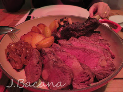 Como prato principal, rib eye steak (contra-filé de costela? Nao sei se a traducao está correta), com batatas assadas e cebola.