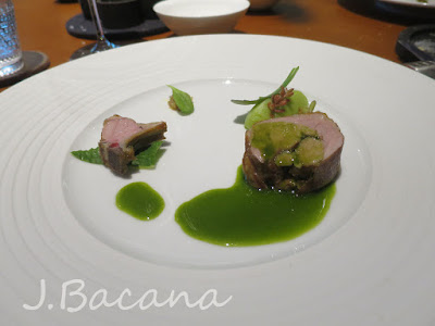 Terceira entrada: mar verde, com langoustine, espinafre e caldo de legumes.